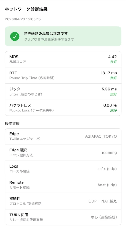 通話中に音声が遅延したり途切れる・無音になる場合や、ノイズが音声の歪み・ネットワークに関するエラーが表示される場合は、一度こちらのネットワーク診断を行っていただき、接続先のネットワークに問題が無いかを確認していただく事を推奨します。